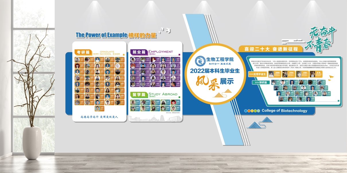 一楼大厅墙体打造毕业生风采展示文化墙,扎实推进学风建设,帮助在校学生明确学习目标和方向,进一步激励学生养成优良学风。