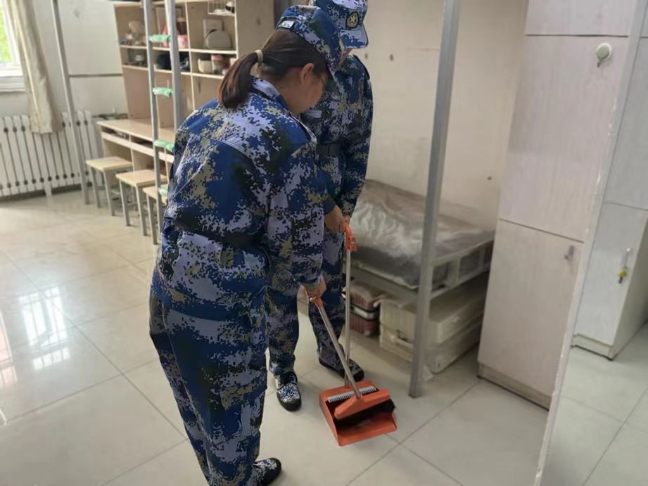 专项组织内务整理行动。学子们对照标准认真整理:有的蹲在床边反复调整被角弧度,有的主动帮助舍友整理床品、打扫卫生。从最初的“手忙脚乱”到后来的“熟练规范”,从个人物品整理到集体宿舍协作,生工学子将军训中的纪律意识转化为内务整理的自觉行动。