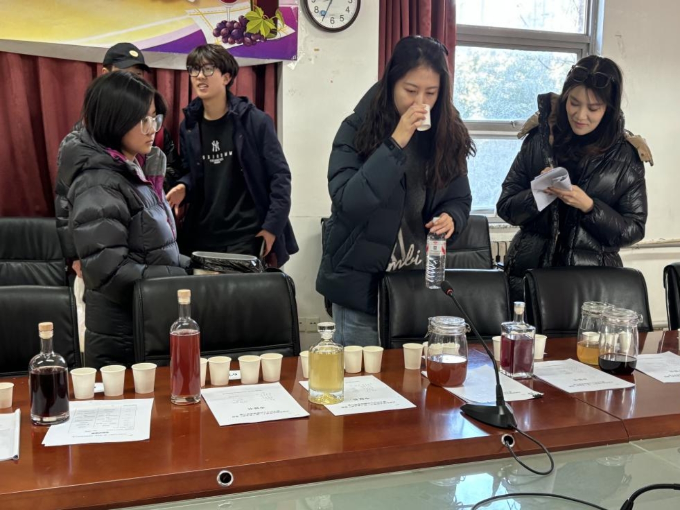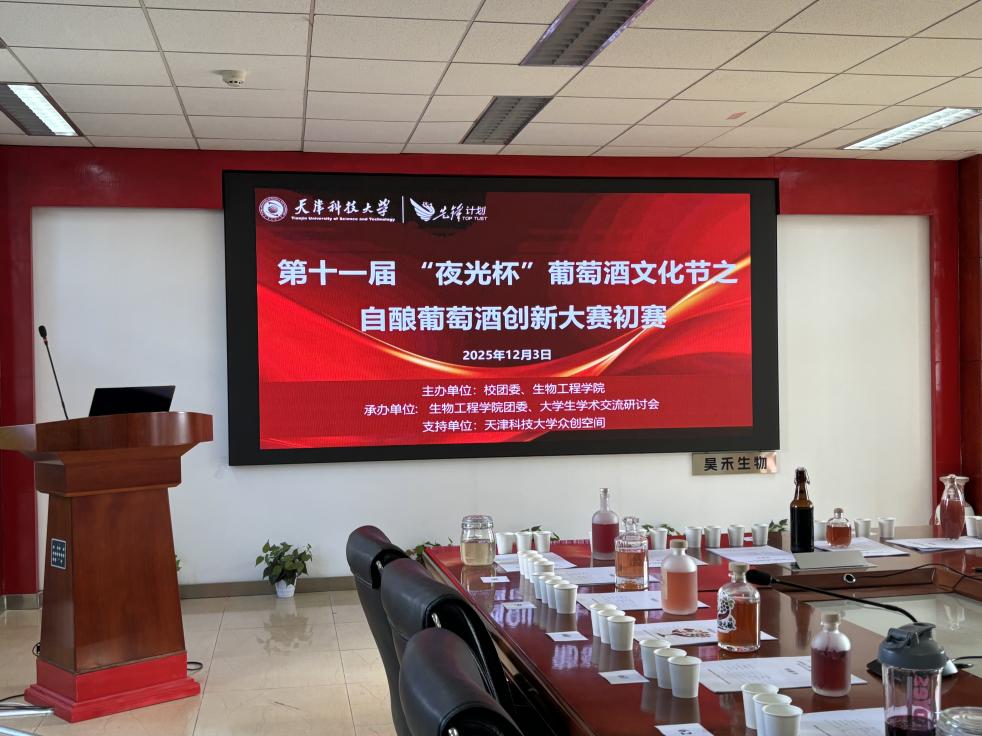 12月3日中午,天津科技大学第十一届“夜光杯”自酿葡萄酒创新大赛初赛在滨海中院2-208会议室正式开启。自11月13日宣讲会播撒下酿酒的种子以来,各院系学子带着近一个月的实践成果,在冬日里呈上了一场关于专业与匠心的味觉盛宴。